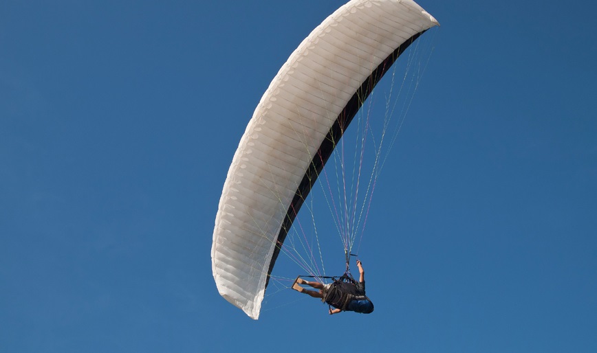Paragliding is the recreational and competitive adventure sport of flying paragliders: lightweight, free-flying, foot-launched glider aircraft with no rigid primary structure. The pilot sits in a harness suspended below a fabric wing comprising a large number of interconnected baffled cells. Wing shape is maintained by the suspension lines, the pressure of air entering vents in the front of the wing, and the aerodynamic forces of the air flowing over the outside.